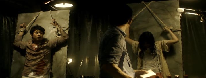その後拉致されて縛りつけられたカップルが。理不尽な質問を繰り返されます。演劇口調でわけのわからん質問されます。