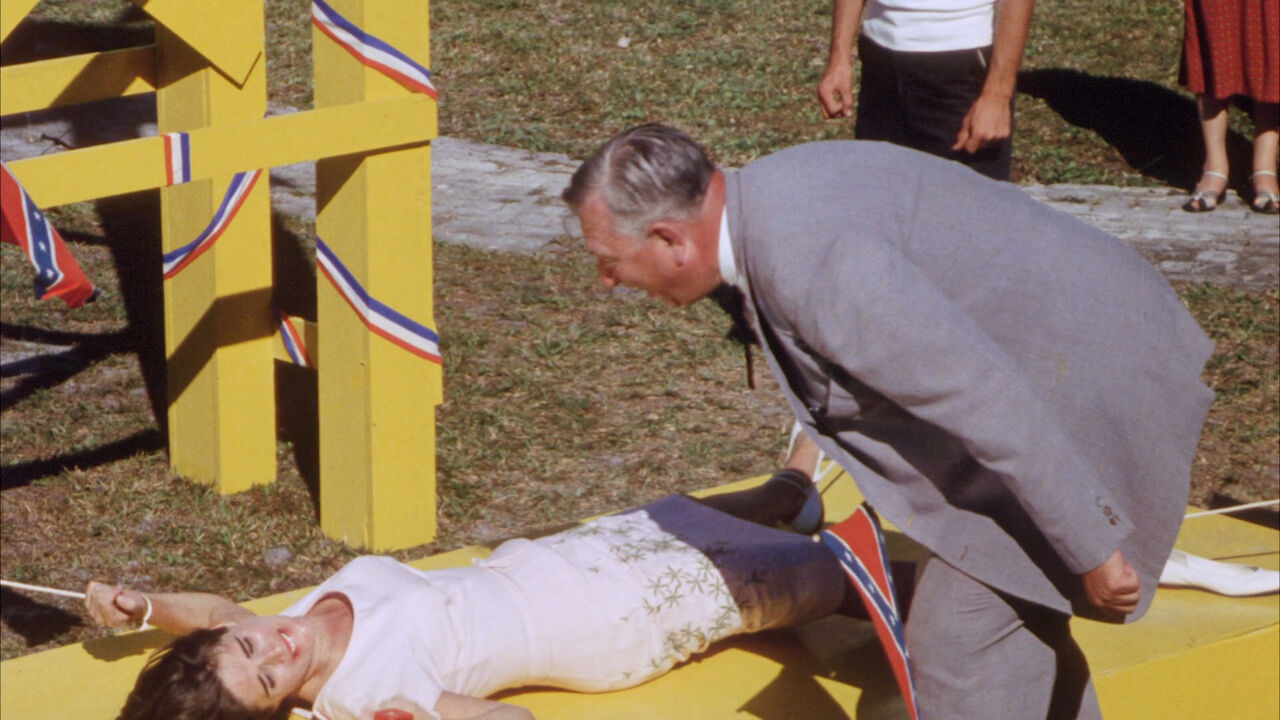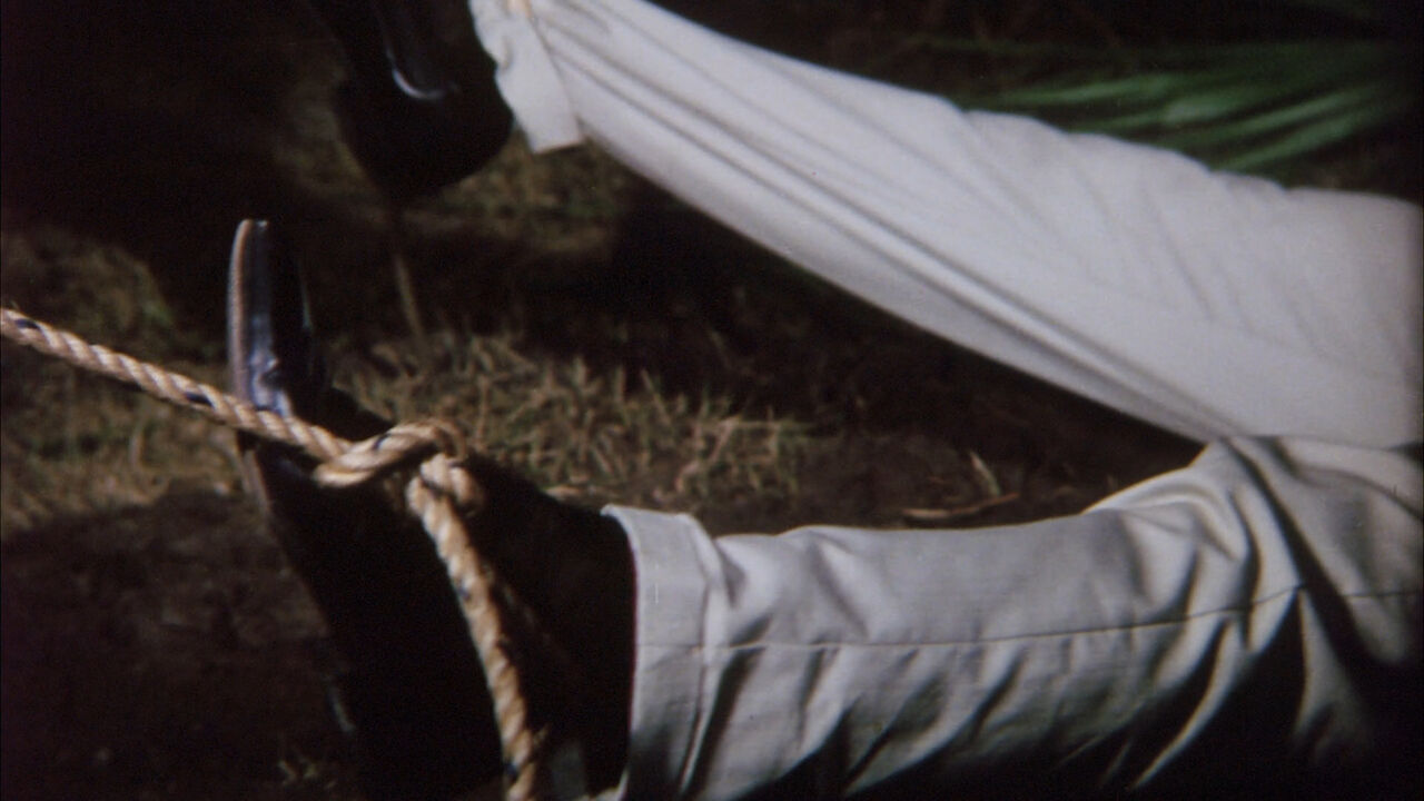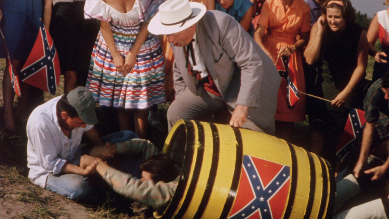 釘の打ち付けられた樽に男が詰め込まれ坂を転がり落とされる。